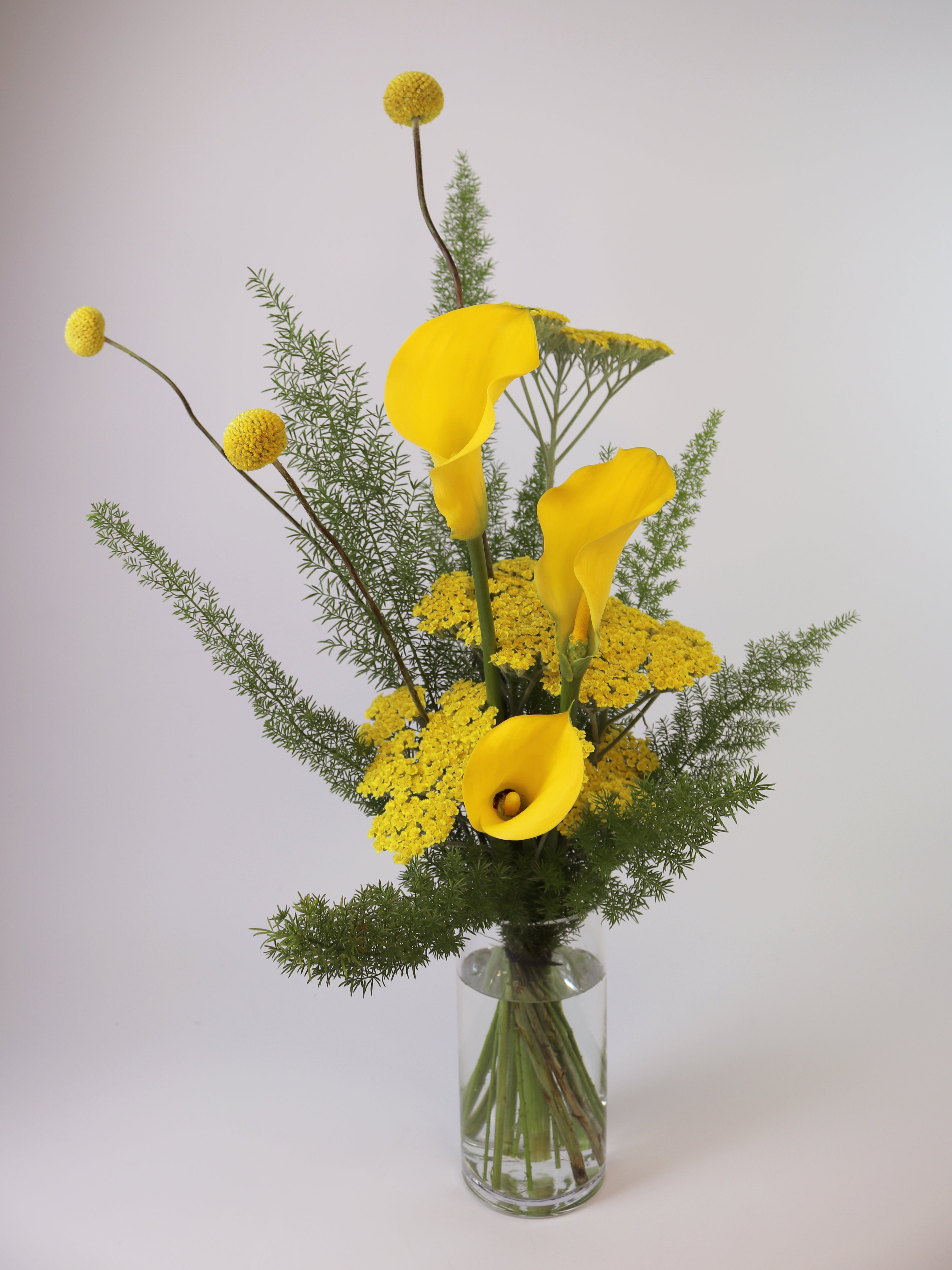 Sunny, contemporary & ready to brighten up any day! Using Calla Lillies, Achilleas & Craspedia in vibrant yellows with dancing green Asparagus Fern; we're ready for Summer & this bouquet is giving energy in a vase.